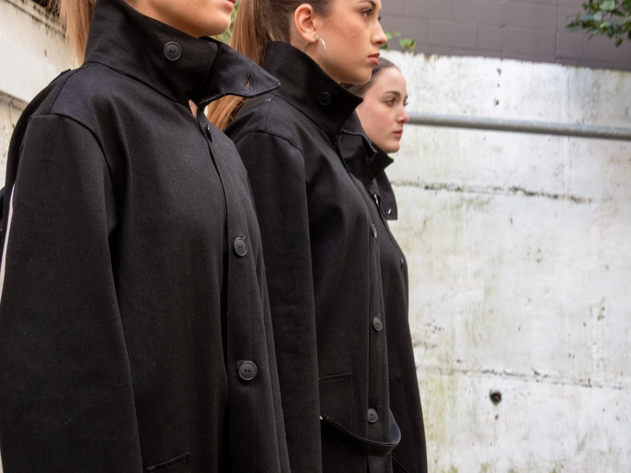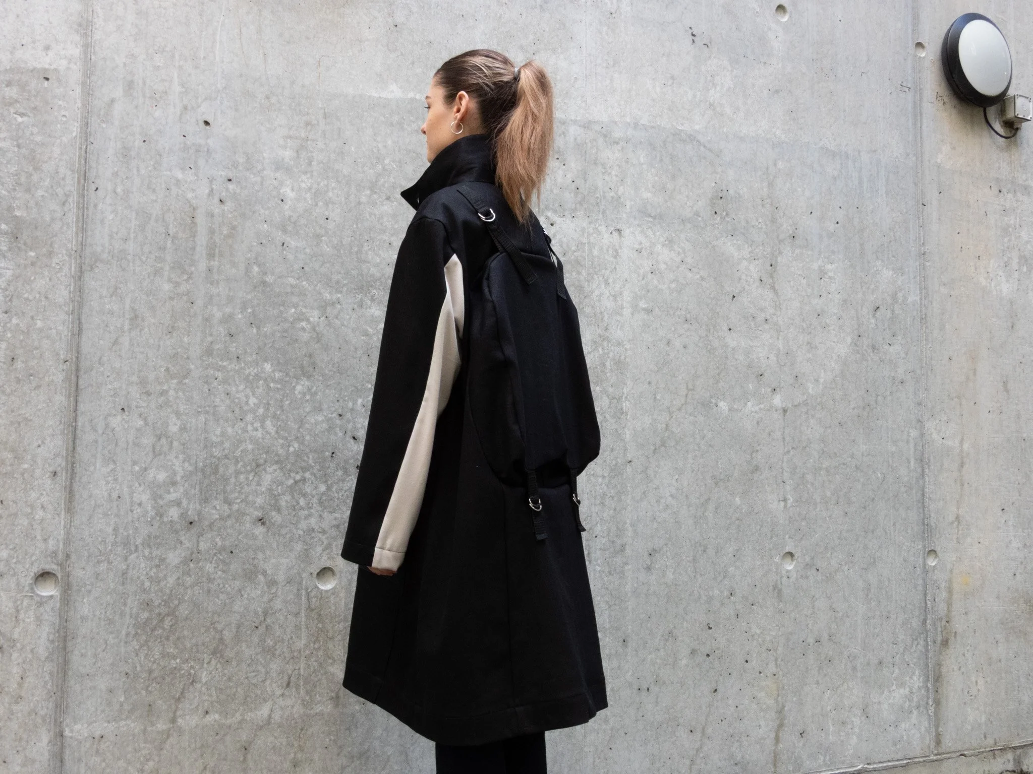 My pre-collection during the first semester of year three saw me actively problem solve through fashion. Millions of us in Auckland tag onto public transport each year, and there are many identifiable pains. Commute is three iterations of the ideal coat for the Auckland commuter. Addressing these pain points and responding to them through supermodern fashion, with evident historical ties like the Mackintosh coat brand and the British WWII anti-gas cape.